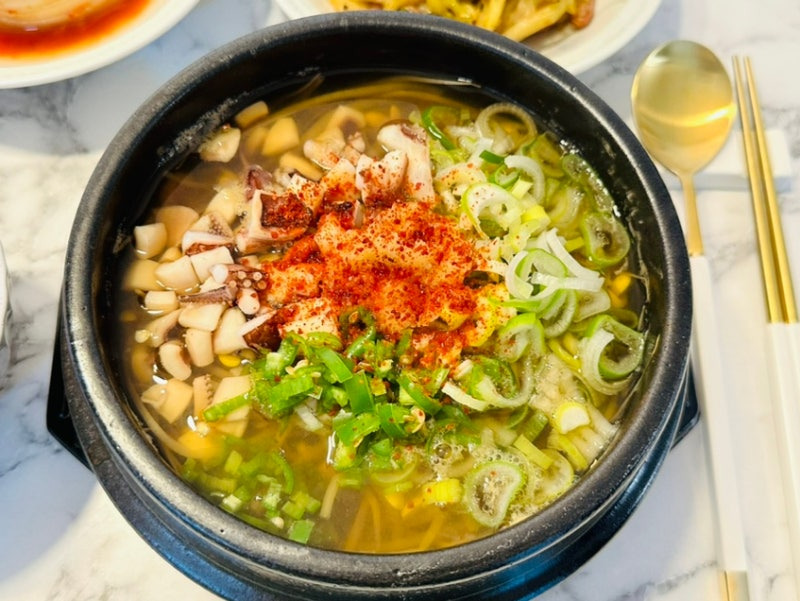 - 국간장과 소금을 넣어 간을 맞추고, 대파와 청양고추를 넣어 2분간 더 끓입니다.